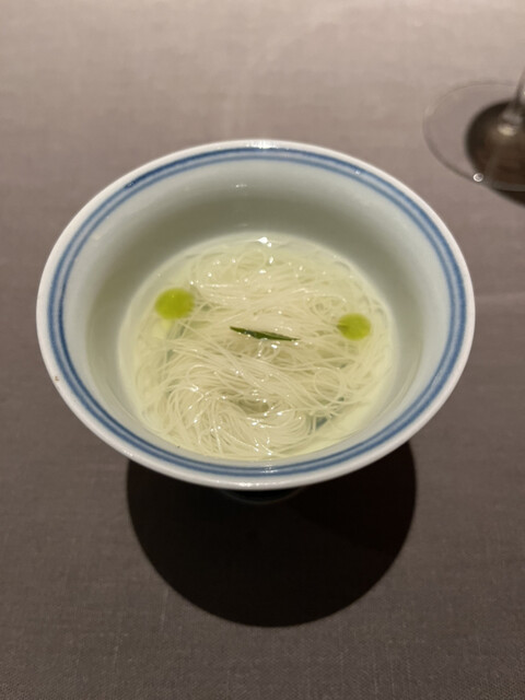 緑茶の油を落とした素麺に始まり、海老の紹興酒漬け、蛤の春巻、焼き物、クラゲ、キジの雲吞スープ、蒸した北寄貝とXO醤・春雨のソース、四川風の鶏手羽スパイス炒め、フカヒレ、豆苗炒め、スペアリブ、追加の麻婆豆腐・ごはんを挟んで、清湯麺、デザートからなる。アルコールペアリングで行ったが、総てにおいて主役の料理を引き立てつつ、料理と合わせることで料理・お酒ともに新たな顔を見せ、味わいに奥行きとバリエーション、イリュージョンを産み出すという点で、完璧に釣り合っていた。お茶も一部いただいたが、料理と飲みもののペアにはお店に強烈な拘りがあり、そのペアを味わってこそ真髄に到れるという気もする。