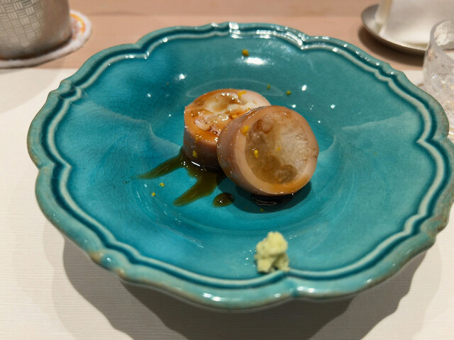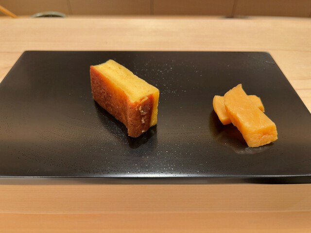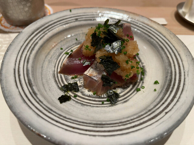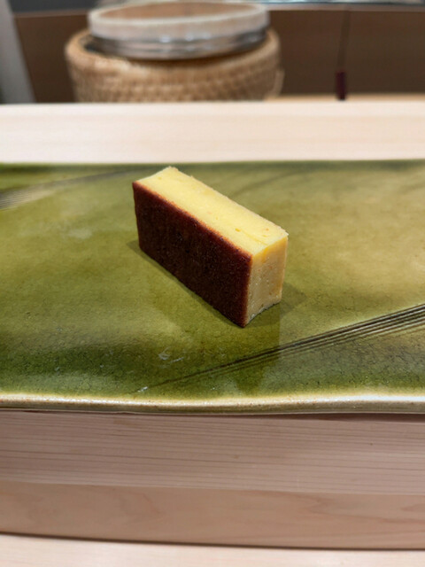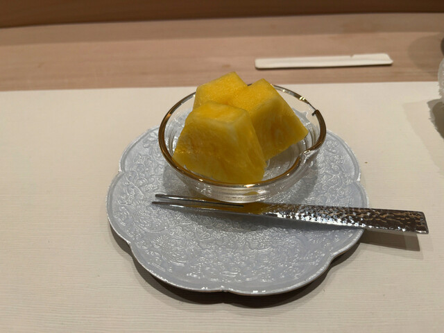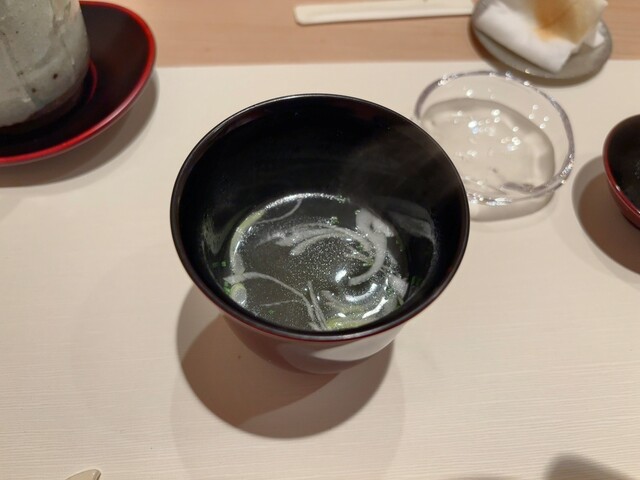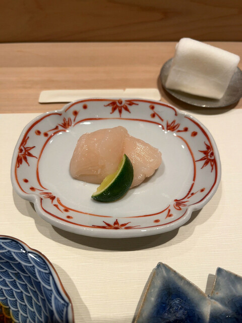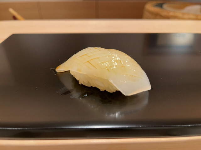 鮨は言うに及ばず。コダイに始まり、イカ、マグロ3種、コハダ、ミル貝、アジ、車えび、金目鯛、ウニ、シマアジ、煮蛤、イサキ、穴子。追加でイサキ。どれも納得の仕事が施されて美味だったが、個人的な好みで、アジ、金目鯛、イサキがトップ3。イサキは皮目を炙って香ばしい仕上がり。身の脂の照り映えも艶やかで色香漂う。最も、艶やかだったのはイサキに限らず、どれも気品のある色香を感じるものばかりだった。