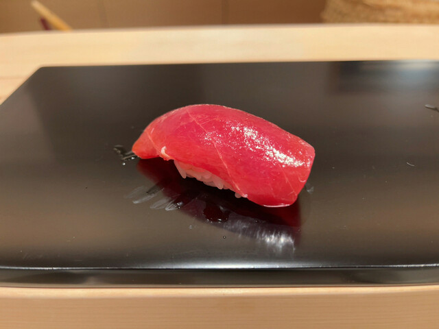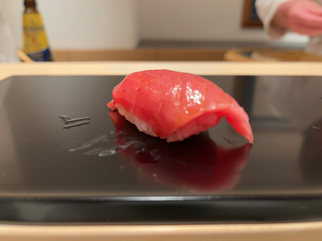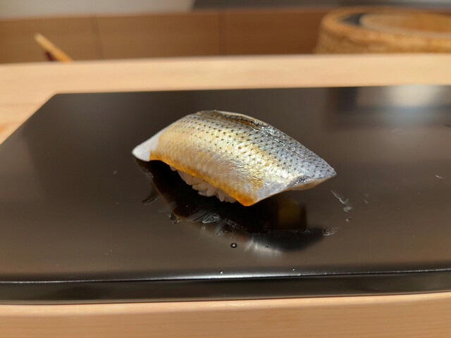 握りも、マグロなどの花形のネタもさることながら、細工を施して出すアジやイワシ、コハダなどの青物、煮蛤などの伝統的な品、どれも素晴らしい仕上がり。起伏もありつつ、最初から最後まで寸分の隙もない展開で魅せてくれた。そんな中のこの日のトップ3は、思わず写真に納める前に掴んで食べてしまったトロ、見た目からして美しかったアジ、細工を利かせたイワシか。
