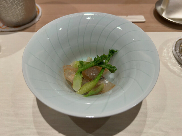 ツマミは冒頭から春らしく、それも桜散り、新芽が芽吹く今のこの時期を断面として切り取った感じ。春を感じる食材でこれでもかと春を感じ、堪能させてくれる。トドメに出て来るカジキの焼き物の絶妙な火加減。中身はフレンチ流に言えばミキュイ。魚を知り尽くす鮨屋の職人ならではの技が堪能できる。