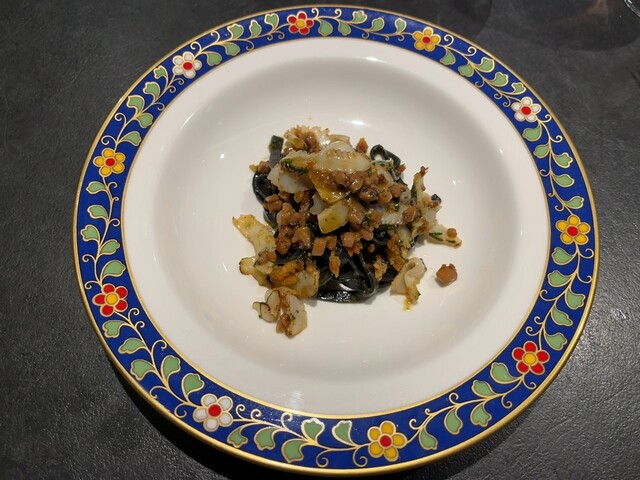 ついこの前取材を受けて、シグネチャー・ディッシュの写真撮らせてください、と言われて「ない」と言ってインタビュアーを困らせたそうだが、それもわかる。前菜からして凄かったのだが、〈甘鯛のフリット〉、〈白アスパラガスとトリュフのリゾット〉、〈豚肉のロースト〉、〈マッシュルームのスパゲッティ〉、〈"イカざんまい"ことイカ墨のパスタ〉、どれもが圧倒的なクオリティを湛えていて、「どれがシグネチャーなんて決められないだろ」という。