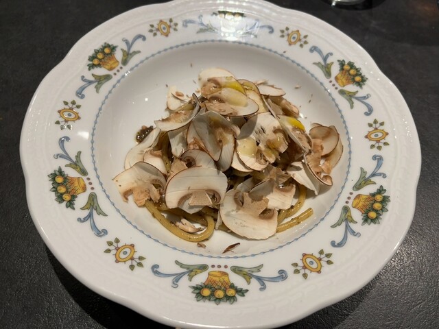 細かく刻んだマッシュルームを炒めてスパゲッティと和えて、上からスライスした生のマッシュルーム。見た目もインパクトあるし、味もとにかくマッシュルーム。
