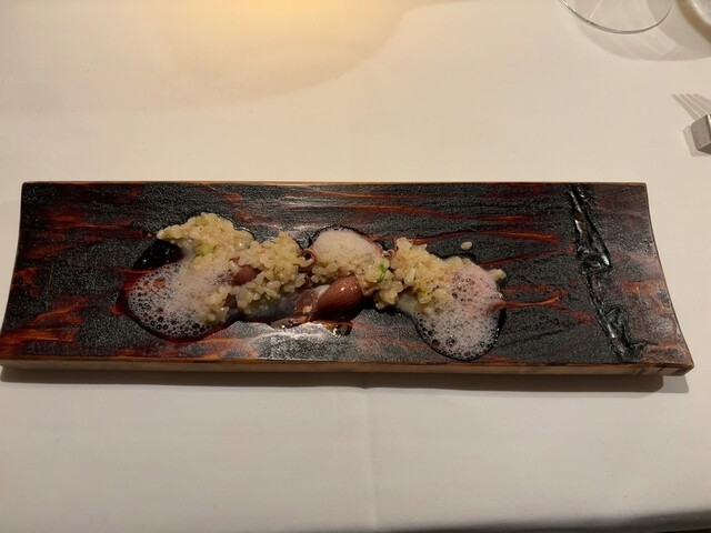 →しいたけのエキス、ダシに似た旨さと熊肉を日本酒で受け留める気の利いたアプローチ。しいたけのダシ感にまともに合わせようとすると、ブルゴーニュなどのワインを引っ張って来ないと難しいので、このお店のコンセプト的には秋田のお酒で受ける判断、大正解と思う。また、熊肉としいたけが味の濃さで真っ向勝負しているところにリコッタチーズも旨味を添えるので、料理そのものは噛むと肉汁としいたけのエキスとチーズが渾然とまざって弾ける旨味爆弾みたいな感じ。