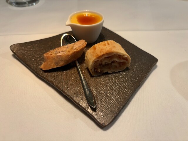 ⑪お茶菓子:紅玉のストゥルーデル、カントゥッチ、南瓜の焼かないクレムブリュレ+コーヒー