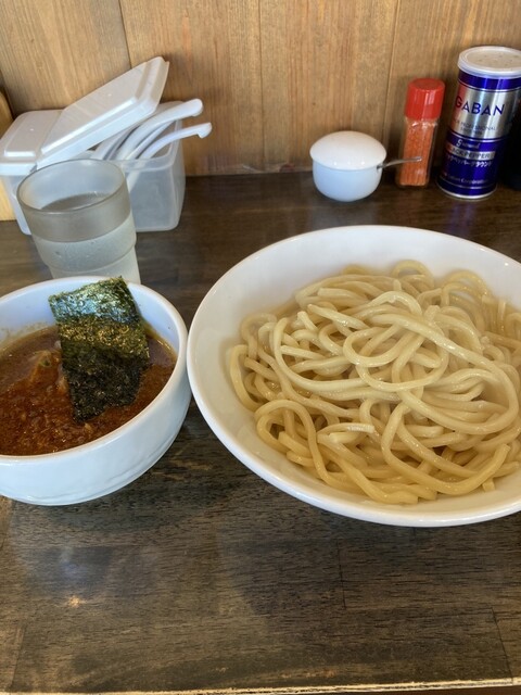 5人がカウンターに着席、4人が中待合で、私は外待ち1人目。20分ほどして中に呼ばれ、食券を購入して中待ち席に。いつも通り、中華そばと迷った挙句、特製辛いつけ麺を中盛りで注文。熱盛りで。