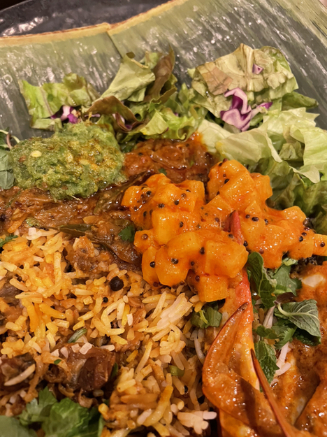 ぷりぷりとした牡蠣の薬膳カレーと青唐辛子チャトニ、マンギャオをバランスよく載せて準備完了です♪