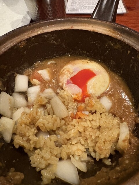ルーが少なくなったらライスと玉葱を全て土鍋に入れて温泉卵をかき混ぜて最後はカレー雑炊に!