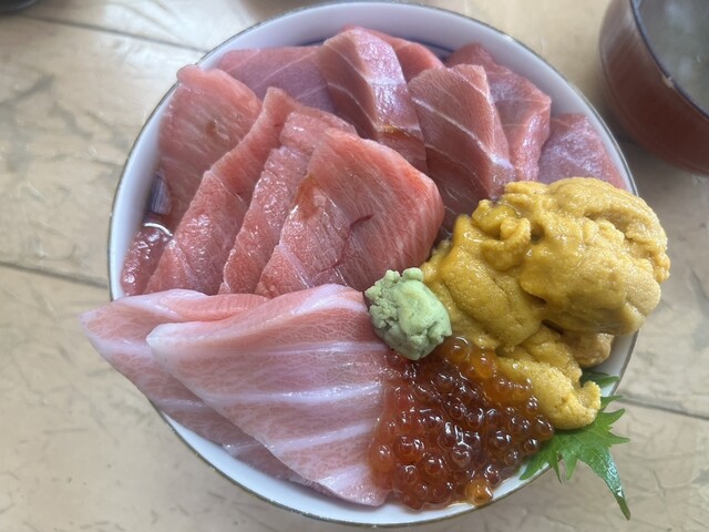 長年の思いから、全乗せ丼(赤身・中トロ・大トロ・ウニ・イクラ)を注文。