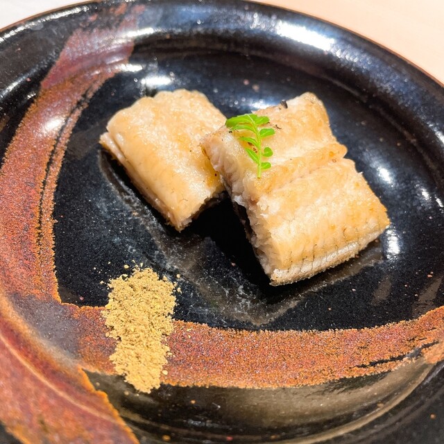 骨切りして薄く2枚重ねた鱧を揚げキャビアの塩分で食べる摘みなど