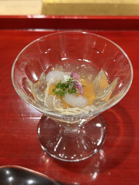 ️先付 雲丹、河豚てっぴ、湯葉、コンソメ、土佐酢ジュレ、シブレット、穂紫蘇