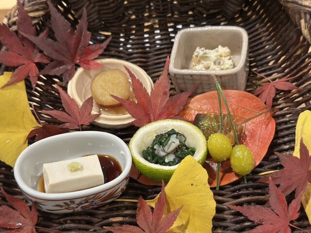 ️八寸、柿の白和え、ほうじ茶で炊いたさつまいも、ジーマーミー豆腐、お浸し、子持ち鮎山椒煮、銀杏など