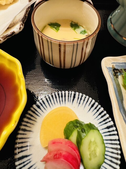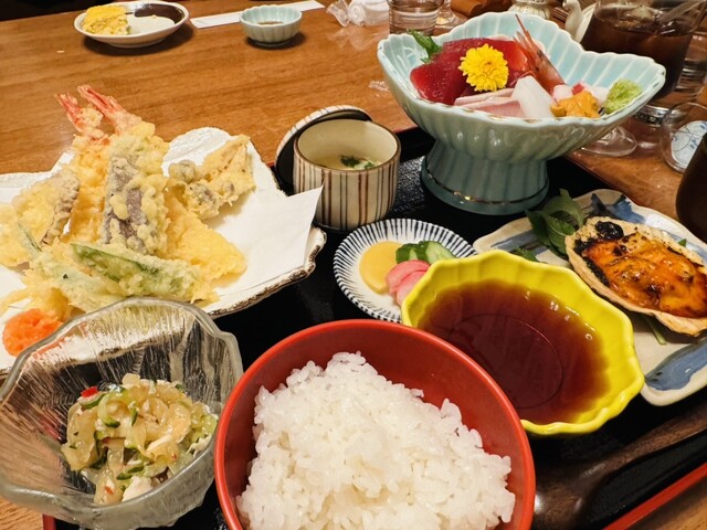 天ぷらにお刺身 小鉢にくらげ甘酢に帆立焼