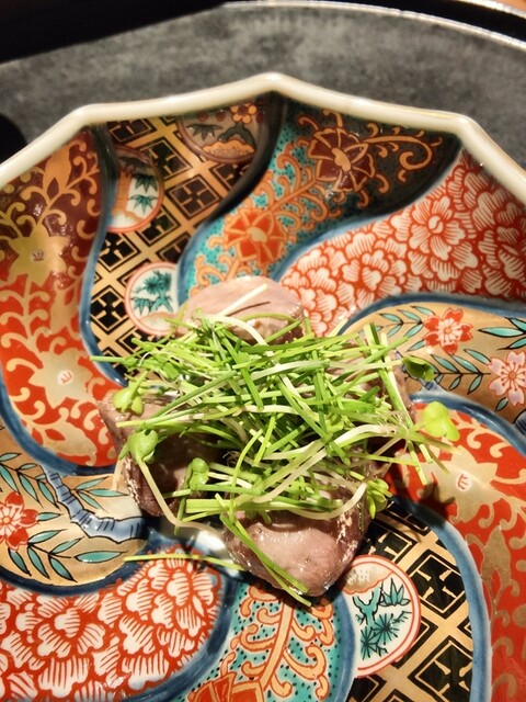 ●高坂鶏 もも肉のお刺身に金柑をからすみ状にしたものを振りかけて頂きます。
