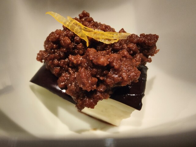 窯で焼いた米ナスに牛タンをひき肉にして桜味噌と合わせたものをかけている
