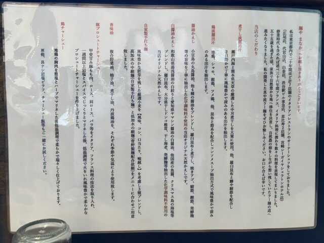 とにかく美味しく頂きました。特にスープが山梨県ではあまりないタイプで、斬新さを感じました。徳栄軒、梅ノ木と並ぶカラダにいいラーメン店がまた山梨県にできてうれしいです。ブラッシュアップにも期待です。ごちそうさまでした。