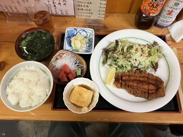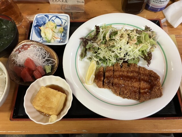 近くに住んでいる人にワンオペで時間かかるけど待つ価値がある美味しい店と紹介されて開店に合わせて伺いました。駐車場は広く停めやすいです。女将さんが1人で切り盛りしています。牛すじカレーを注文しましたが品切れ、とんかつ定食を注文しました。ボリュームいっぱいのとんかつにライス、みそ汁、サラダ、揚げだし豆腐、そしてマグロの刺身まで付いてコスパが良いです。次にお邪魔する機会があれば、ぜひカレーをいただきたいと思います。