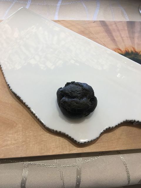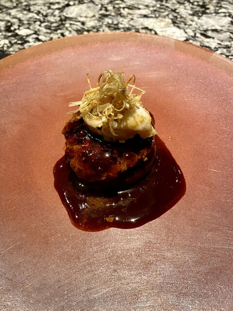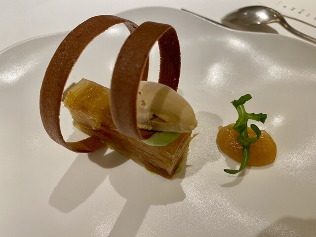 琥珀色のシャンパンから始まり、前菜は秋のイメージで見た目も美しく味も美味しい。