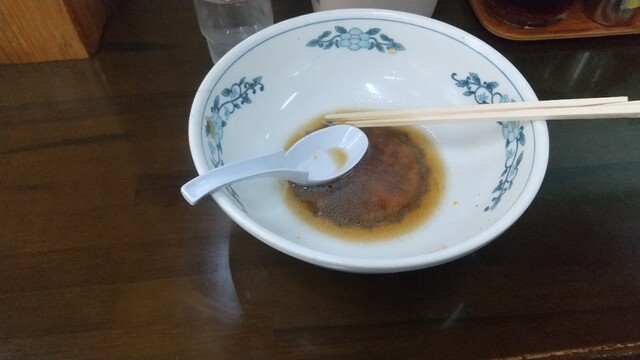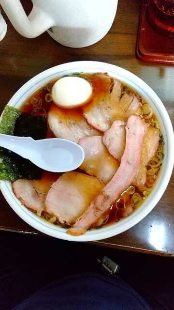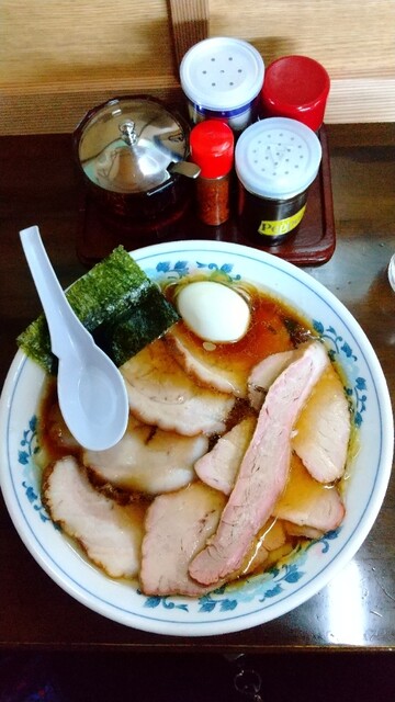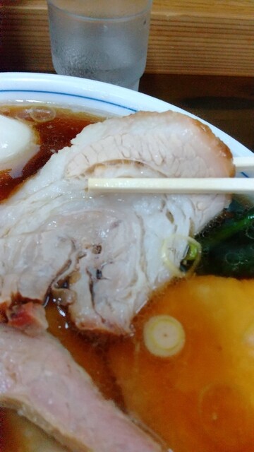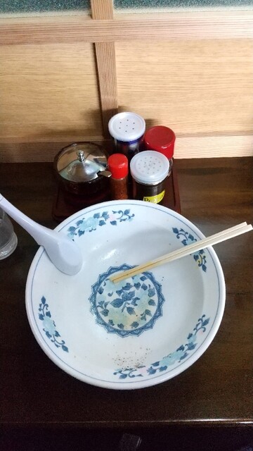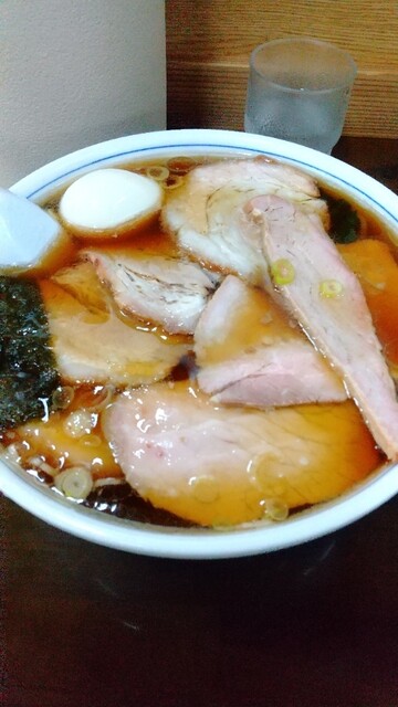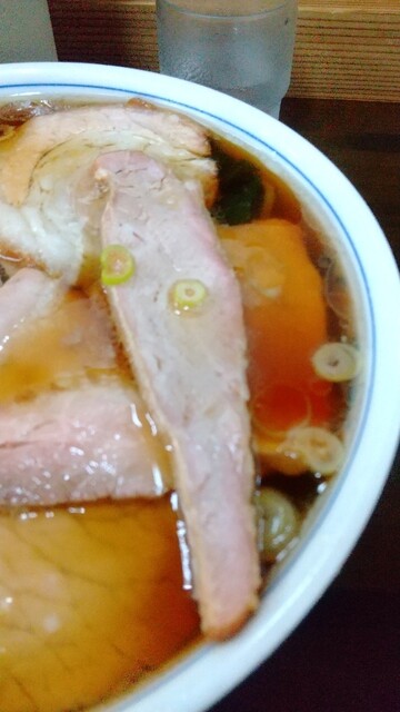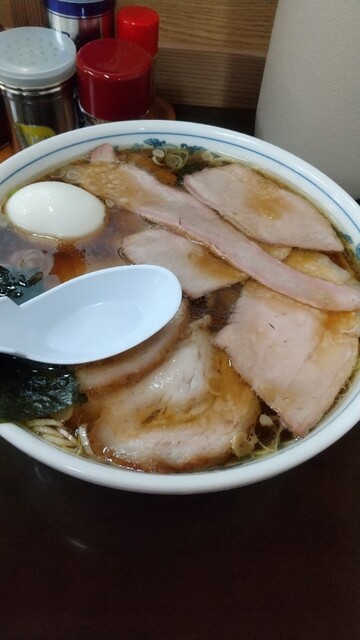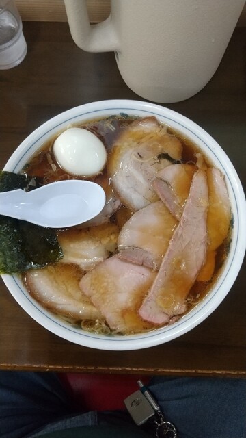 10分弱で店内へ、オーダーは息子がワンタンメン❗️あっしが初の焼豚メン大盛❗️(残念だすが煮玉子忘れてぐすん)