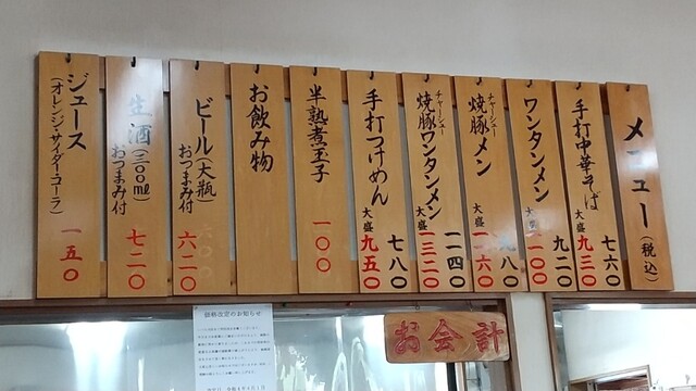 駐車場に11:50に入りやしたが既に県外ナンバー多で混みあっていやしたので裏手の駐車場にオン。12:44にやっとこさ入店&オーダー、あっしはワンタンメン大盛+煮玉子、息子1が手打つけめん、息子2が手打中華そば+煮玉子だす!13:11着丼。