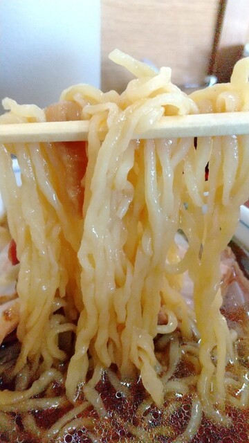 自家製麺の中太縮れ麺もコシがありやして旨いねぇ~(^^)d