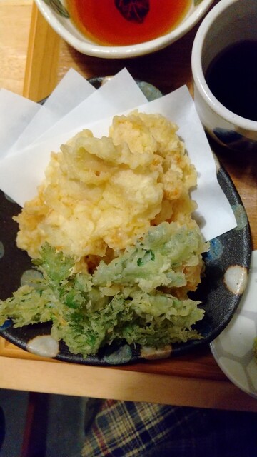 天婦羅は春菊(甘味を感じる旨さ)と、とり天は歯がいらない柔らかさ(^-^)v が7個、そばは細目で綺麗なそば、歯応え喉越し共に◎だす、但し香りが弱めなのがちと残念だすなぁ(T-T)