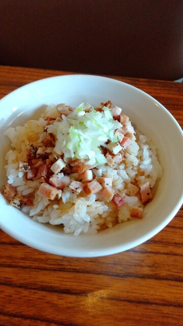 チャーシューごはんはラーと違って葱が散らばっていやす!ここに煮干スープをかけて・・・旨しねぇ‼️