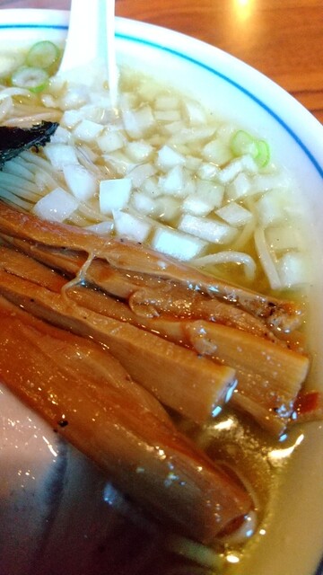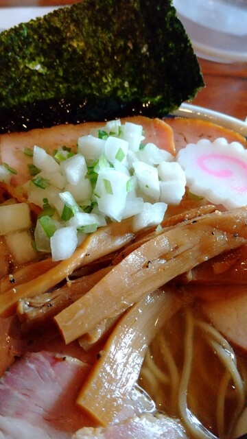 ほんのりと煮干し香る濃い目のスープじゃが、甘味を感じる❗️スープに入っている刻み玉葱の甘味❓️それと玉葱の食感がいいねぇ❗️旨しなんじゃが、後半に口内に脂が残る感じで喉が乾きやした!