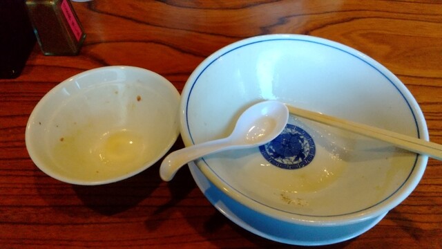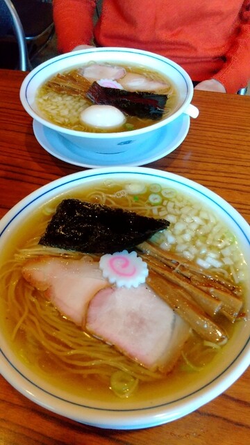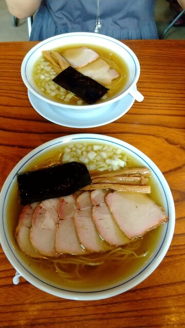 友が食すは、中華そば煮玉子入り+肉ごはん(小)、あっしは中華そば大盛だす❗️