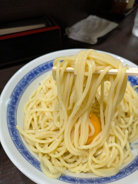麺は丼一杯に盛り付けられ中央に生卵が落とされ艷やかな綺麗な麺。