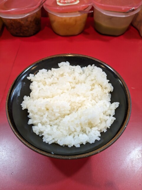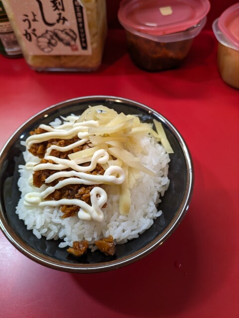 ライスには無限ニンニクとマヨネーズ。海苔巻きご飯で食べ進めます。