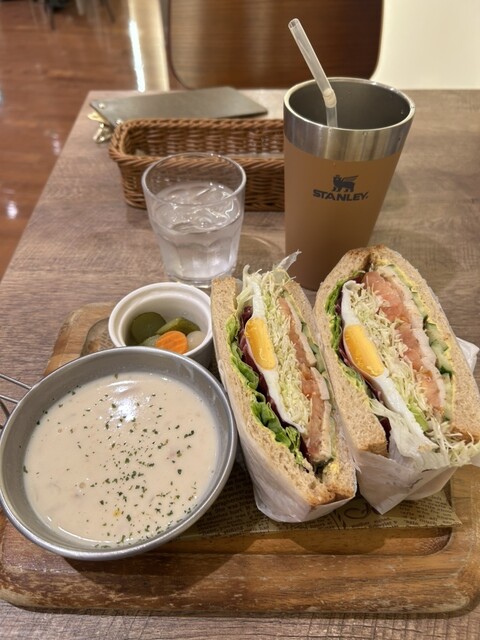 サンドイッチが好きなのですが、色々チョイスがあります。そして野菜たっぷり。スープとスタンレーのカップに入ったアイスティー、ピクルスがついてお値段は1500円以下。他にカレーやハンバーグ焼きカレーなども美味しそうです。