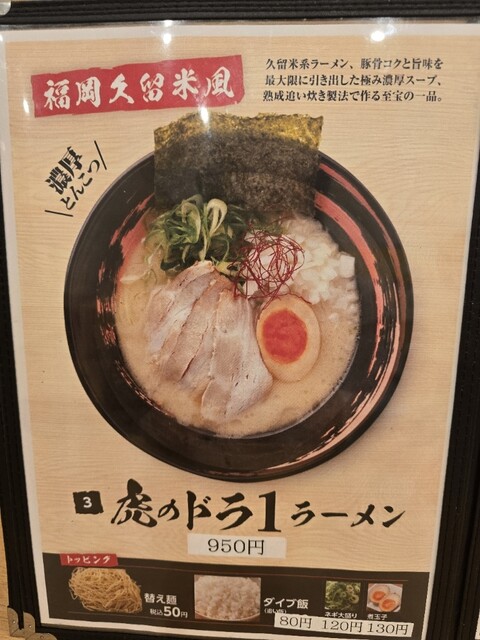 博多風と久留米風の2種類のとんこつラーメンを中心に、まぜそば、牛骨冷麺などのメニューがあります