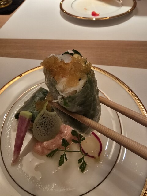 ・真鯛の煮こごり太刀魚の八幡巻き・ 蟹とたこのバジルソースがけ •はす芋の胡麻クリームかけ・まるじゅうさつま芋の蜜煮
