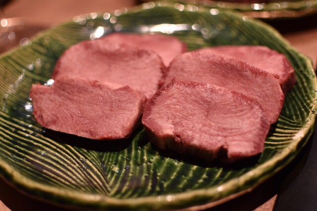 岩手県産黒タン。黒泉さんのメニューの中で一番好きです。かなり厚切りのタンで断面は綺麗なピンク色。表面がカリッと香ばしく、噛み締めると中は弾力がありサクっとしていて閉じ込められた肉汁がジュワーっと広がります。炉釜の遠赤外線効果恐るべしです。