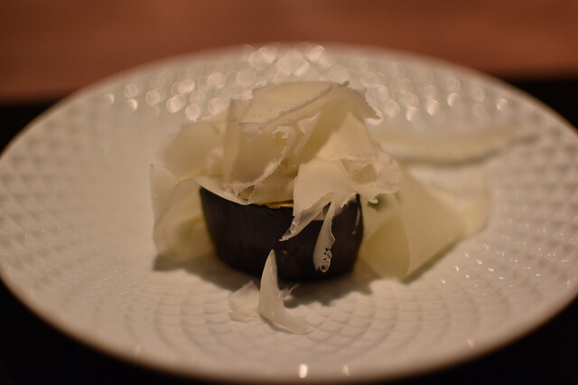 炉釜でローストした香味野菜に「ラスパドゥーラ」という珍しい技法で薄くスライスしたチーズがたっぷりとかけます。チーズはふんわりと空気感があって濃厚でローストした野菜の甘味との相性が最高です。
