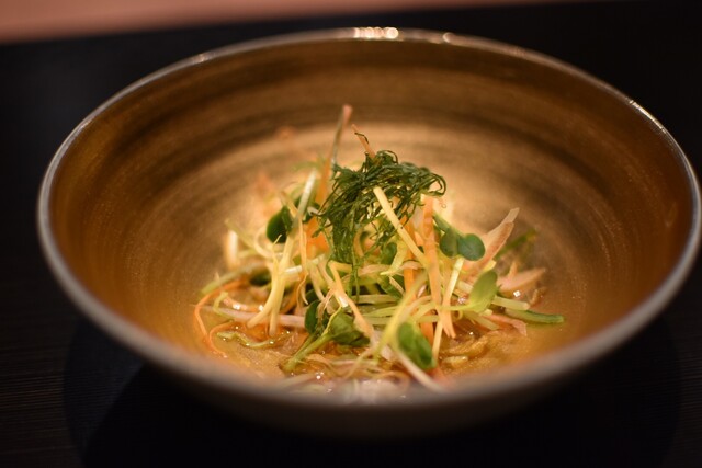お口直しと言われて登場したGANTZみたいな丸いお碗。蓋を開けると冷製の梅酢和えが入っていました。付け合わせには糸瓜の酢の物、冥加等があって非常にさっぱりとしています。