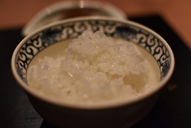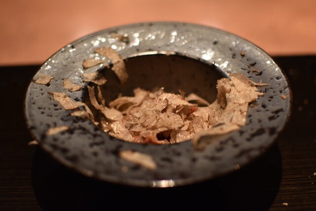 薄切りのサーロインと卵黄の上に惜しげもなくサマートリュフをしゅりしゅりしゅりしゅり!お箸でサーロインを掴み卵が泡立つまで攪拌したら完成。濃厚に絡みつく卵黄とトリュフの香りがサーロインの旨味を引き立てます。そして余った卵黄ご飯投入してトリュフTKGに。