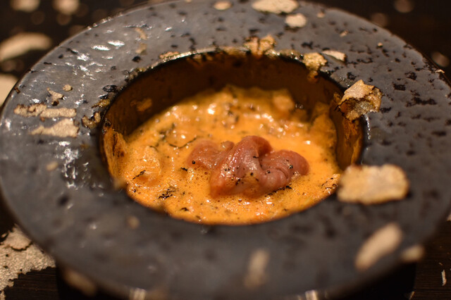 シャトーブリアンとテートの炉釜焼き。なんとシャトーブリアンの余った部分をほとんどいただきました。ブリアン10切れくらい食べたかな(笑)タンと同様に炉釜で火入れをしているので肉汁を逃すことなく焼き上がるので表面カリカリで中はしっとりとしています。そしてもう一つの部位のテートはヒレ肉の中でも赤身の味わいが強い気象部位で肉自体の味が非常に濃く、噛み締めるたびに旨味が広がります。