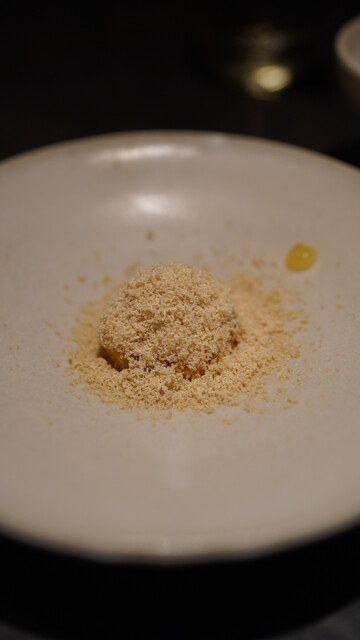 52℃に熱したフォアグラのテリーヌを液体窒素で−196℃に凍らせてから擦り下ろすフレンチトースト。一口食べると思わず「うま!!」と声が出ました。とにかくフォアグラがふわっふわでフレンチトーストとの甘さとフォアグラの塩気のバランスが神がかっています。