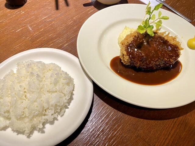 メンチカツの下にはめちゃめちゃ滑らかなマッシュポテトが敷いてあって、メンチカツの衣の脂を適度に吸ってくれてウマウマ。
