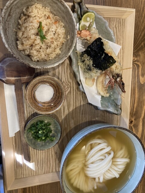 ひやかけ、熊海老とお魚の天麩羅盛り合わせ、かしわ飯