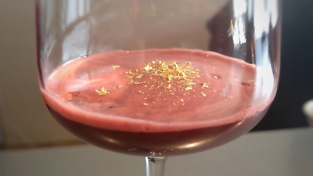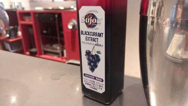 カシスカクテル - 濃縮カシスに和三盆とコーヒーを合わせたカクテル、ローズシロップをかけたクリームチーズが付きます。カシスとコーヒーのエッジが鋭く効いた味わいにフリーズ。クリームチーズのコクがとても合います