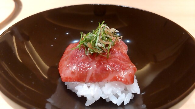 肉鮨 - 純血但馬万葉牛36ヶ月肥育のリブ芯。軽やかな酢とシャリの旨み、力強い肉の甘さにフリーズ。こんなに甘みのあるリブ芯は初めてでした