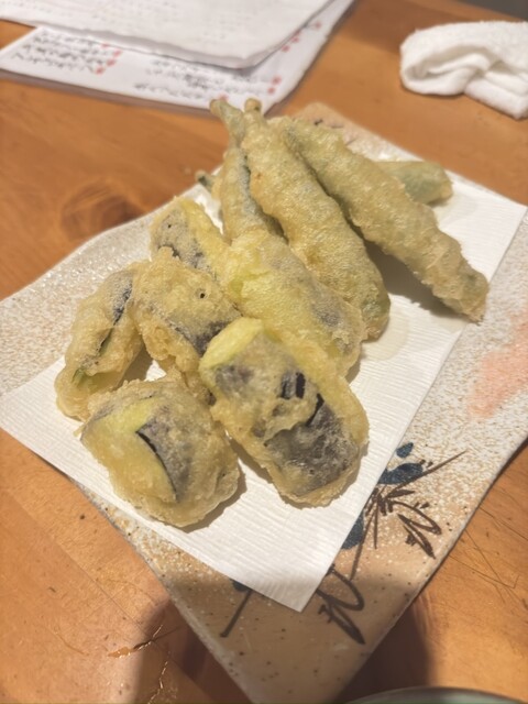 天ぷら…オクラと茄子をいただきました。どちらも外はサクッと、中は瑞々しく野菜の旨みが出ています。