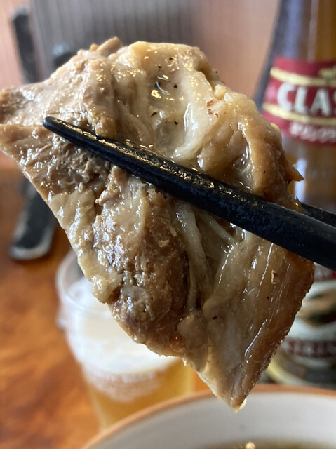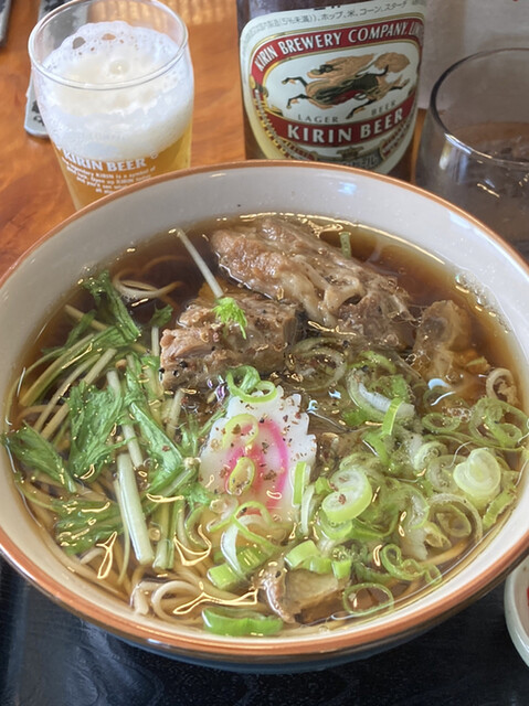 刺身をアテにビールを飲んで、豚軟骨蕎麦をオーダー、豚軟骨…いわゆる軟骨ソーキでございます。
