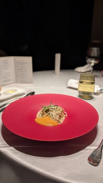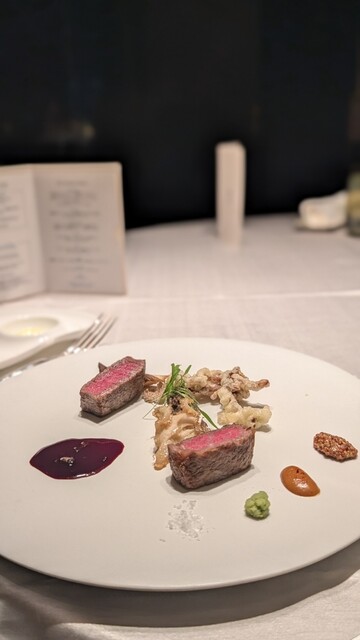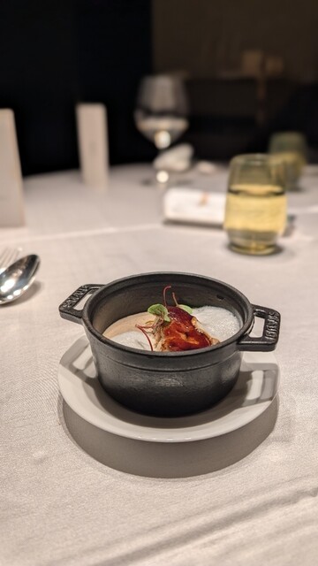 ・ポタージュ、ポーチドエッグ、グラタンの三層の組み合わせ、初体験だったが、良く調和していて美味しかった。
