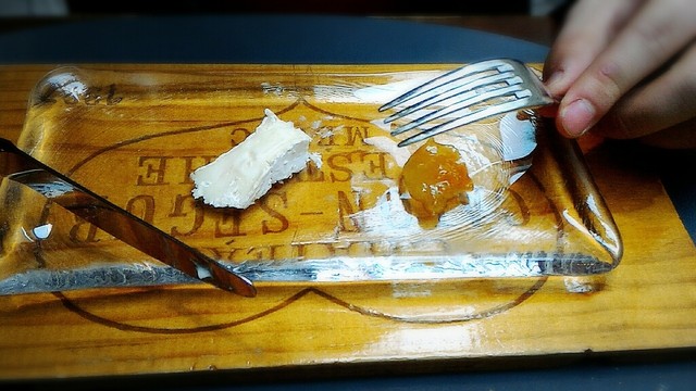 デザート前に倅は白カビタイプ、夫は山羊のハードタイプのチーズ。(