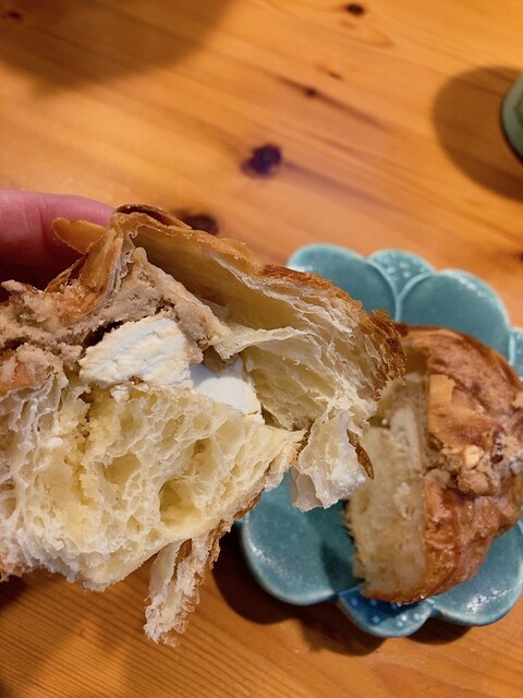 ハード系のバン生地の間にヨーグルトクリームチーズが練り込まれりんごの角切りとナッツ多め