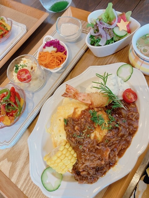 オムハヤシ、大人のポテサラ、エビフライ