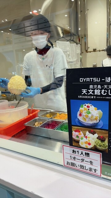 並んでいる間にガラス張りの所で職人さんの作っているのを眺めていると、かき氷をてんこ盛りしてからストローかな?穴をサクサク開けています。